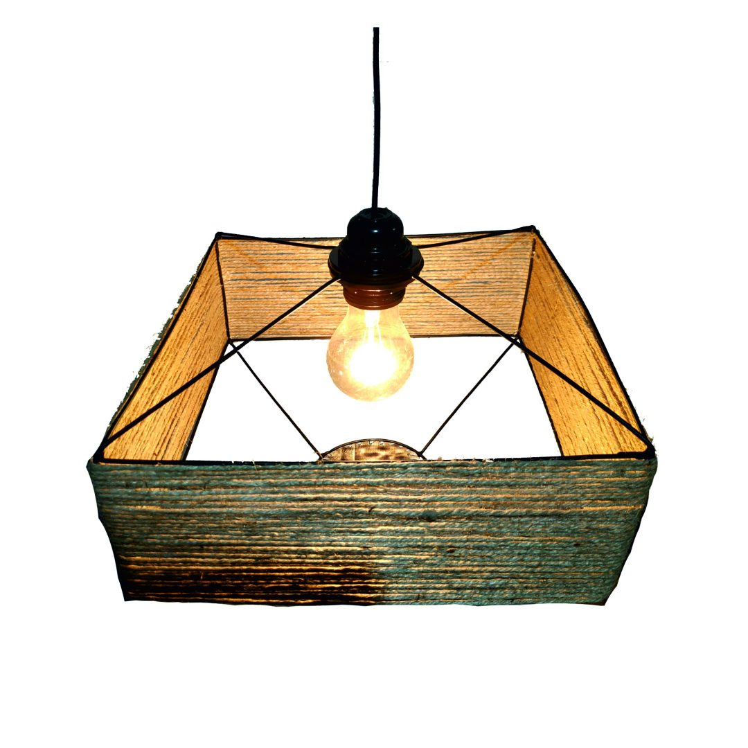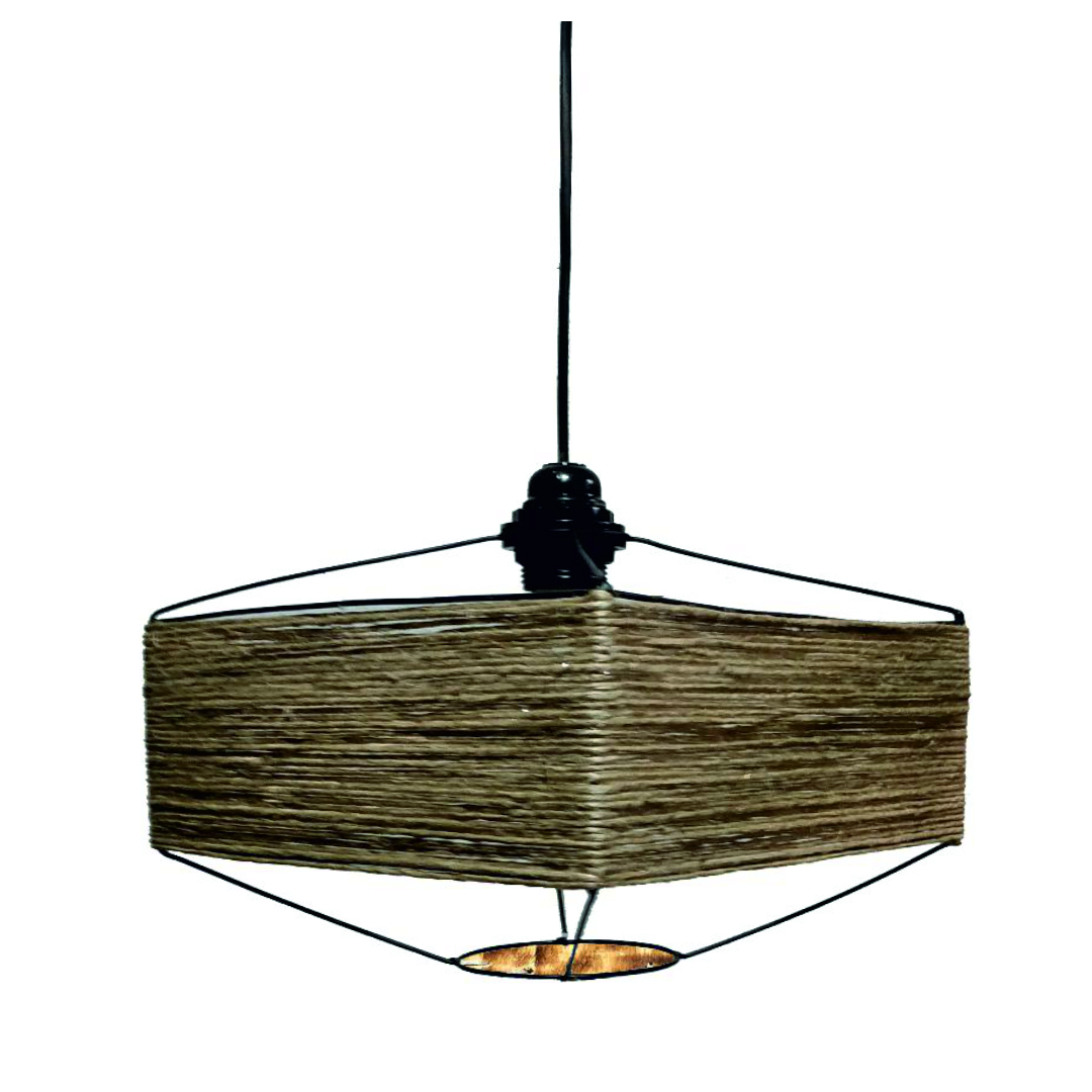 Χειροποίητο φωτιστικό κατηγορίας Βιομηχανικά Φωτιστικά ή Φωτιστικά Κλουβιά. Φωτιστικό κατασκευασμένο από σύρμα 3 χιλιοστών διακοσμημένο με γιούτα και επιφάνεια κόντρα πλακέ.